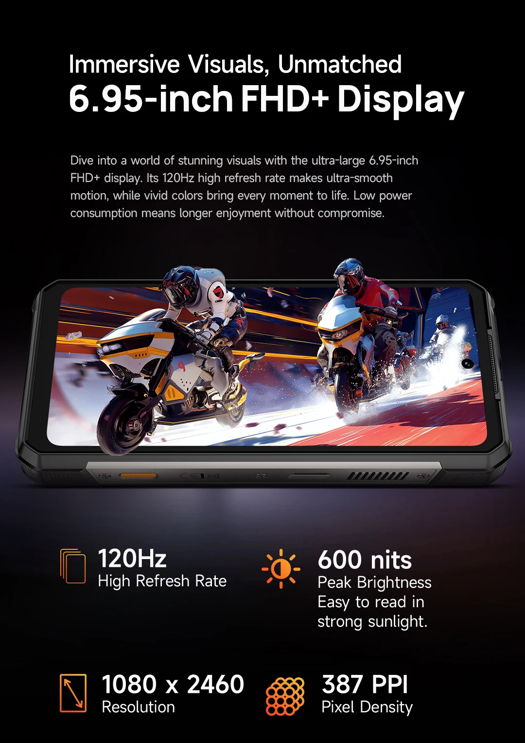 Dive into a world of stunning visuals with the ultra-large 6.95-inch FHD+ display. Its 120Hz high refresh rate makes ultra-smooth motion, while vivid colors bring every moment to life. Low power consumption means longer enjoyment without compromise.