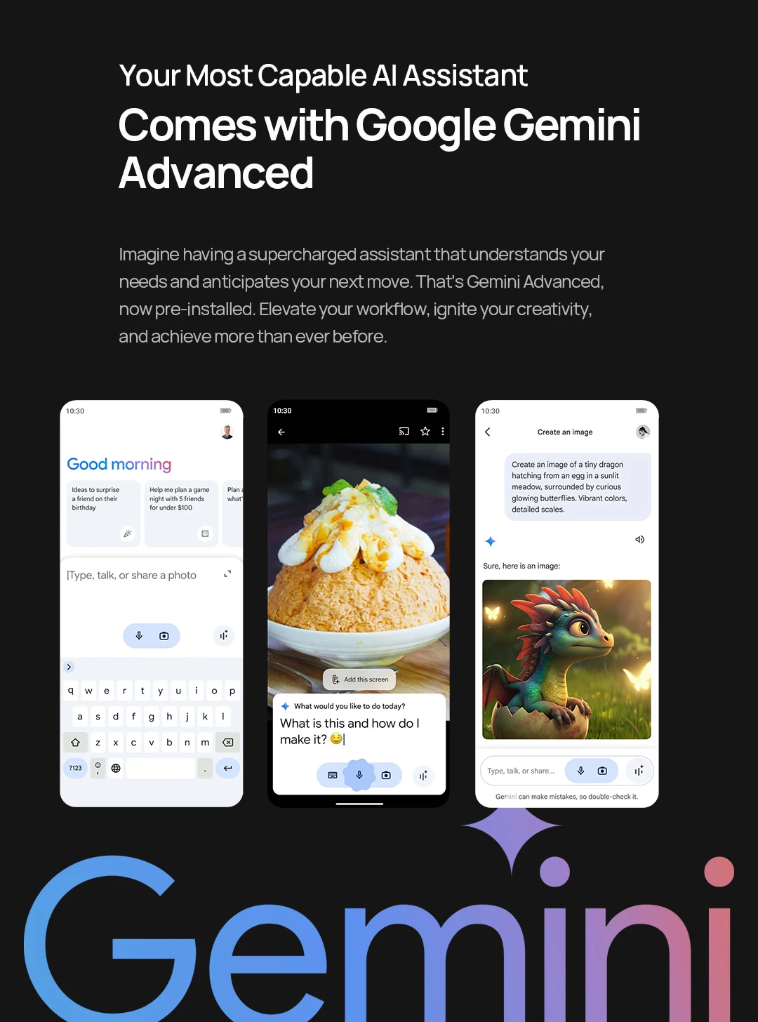 Imagine having a supercharged assistant that understands your needs and anticipates your next move. That’s Gemini Advanced, now pre-installed. Elevate your workflow, ignite your creativity, and achieve more than ever before.