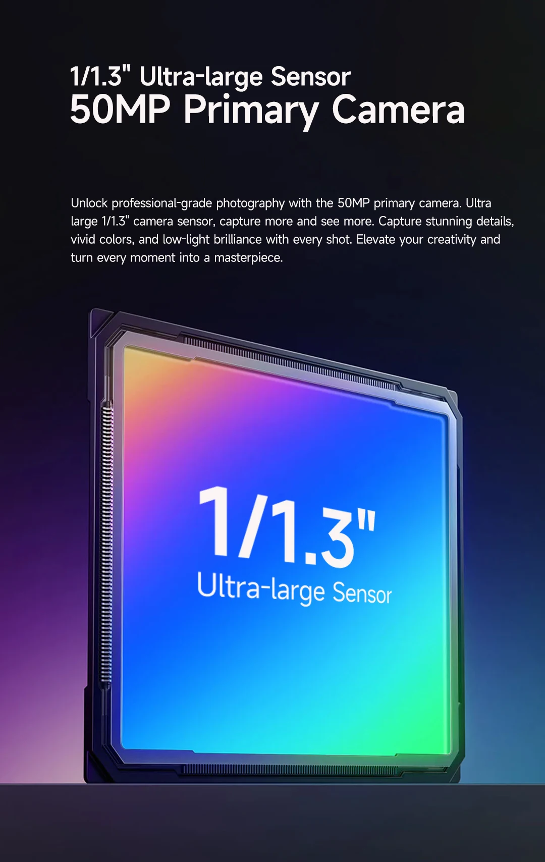 Unlock professional-grade photography with the 50MP primary camera. Ultra large 1/1.3″ camera sensor, capture more and see more. Capture stunning details, vivid colors, and low-light brilliance with every shot. Elevate your creativity and turn every moment into a masterpiece.