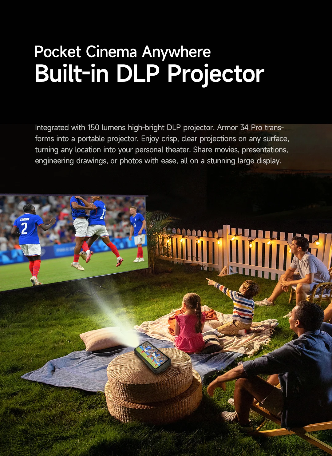 Integrated with 150 lumens high-bright DLP projector, Armor 34 Pro transforms into a portable projector. Enjoy crisp, clear projections on any surface, turning any location into your personal theater. Share movies, presentations, engineering drawings, or photos with ease, all on a stunning large display.