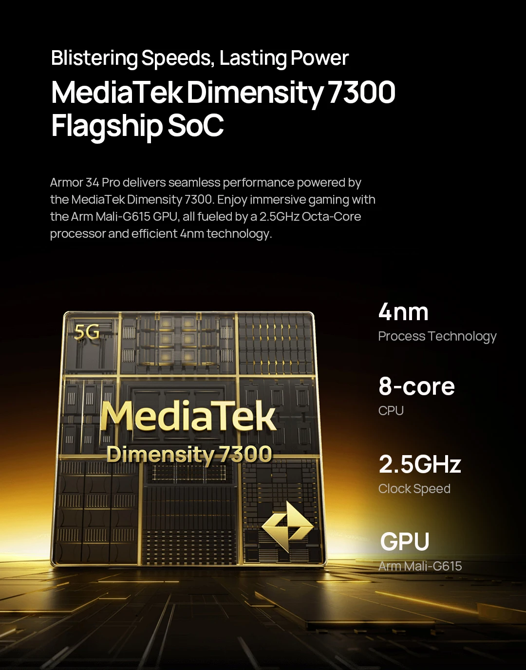 Armor 34 Pro delivers seamless performance powered by the MediaTek Dimensity 7300. Enjoy immersive gaming with the Arm Mali-G615 GPU, all fueled by a 2.5GHz Octa-Core processor and efficient 4nm technology.