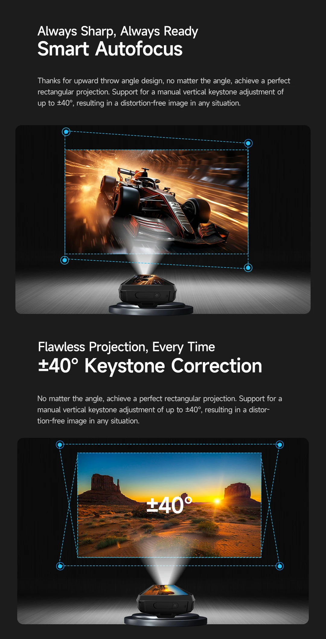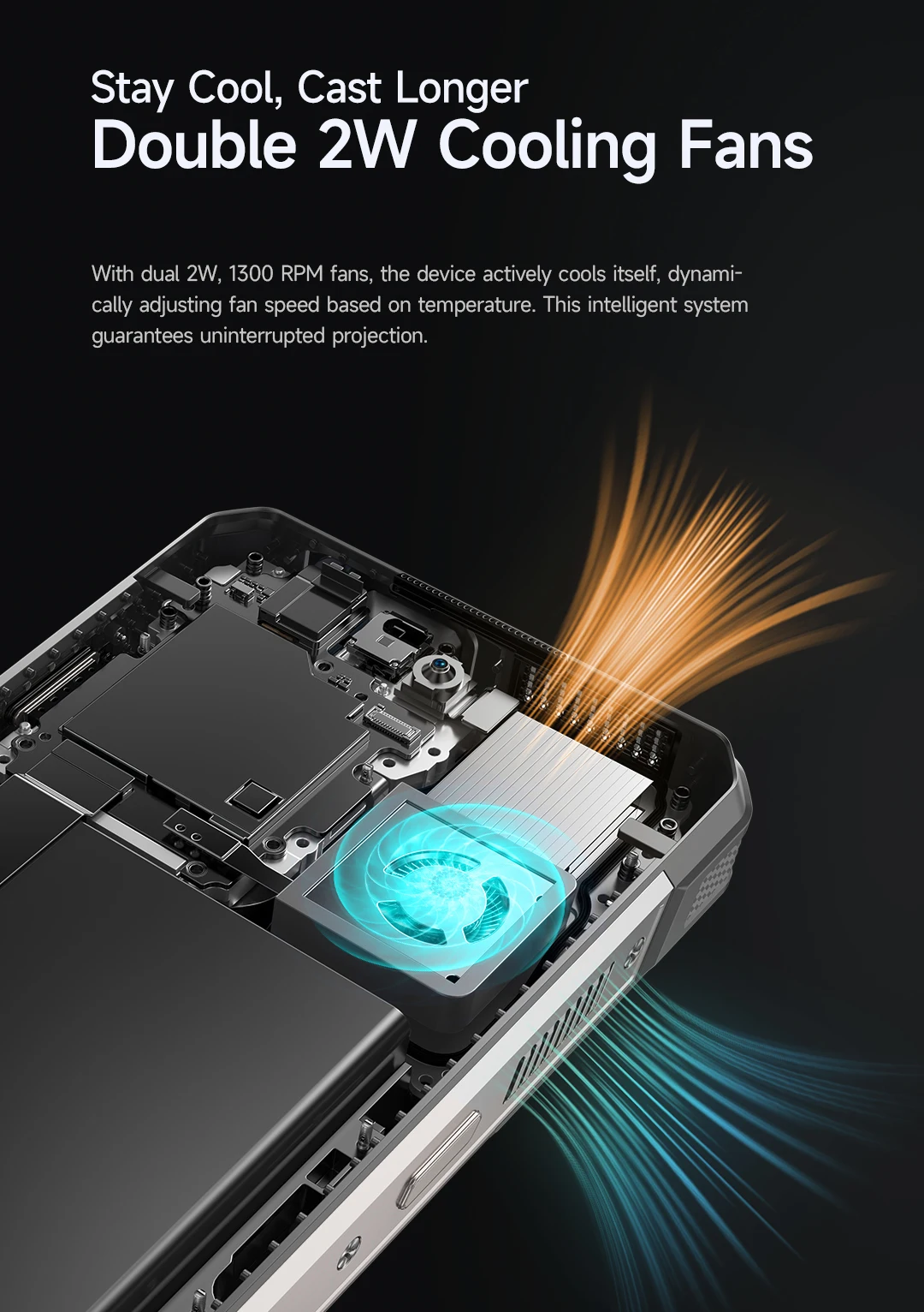 With dual 2W, 1300 RPM fans, the device actively cools itself, dynamically adjusting fan speed based on temperature. This intelligent system guarantees uninterrupted projection.