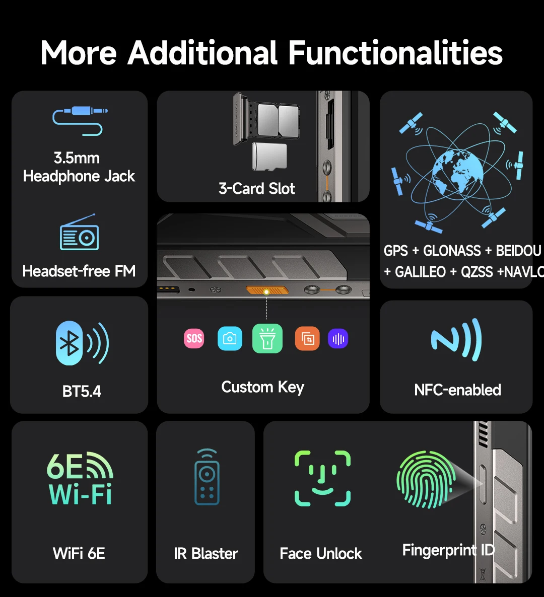 • Android 15 | Nano+Nano+microSD |NFC | IR Blaster|Versatile LED Light | Warning Light