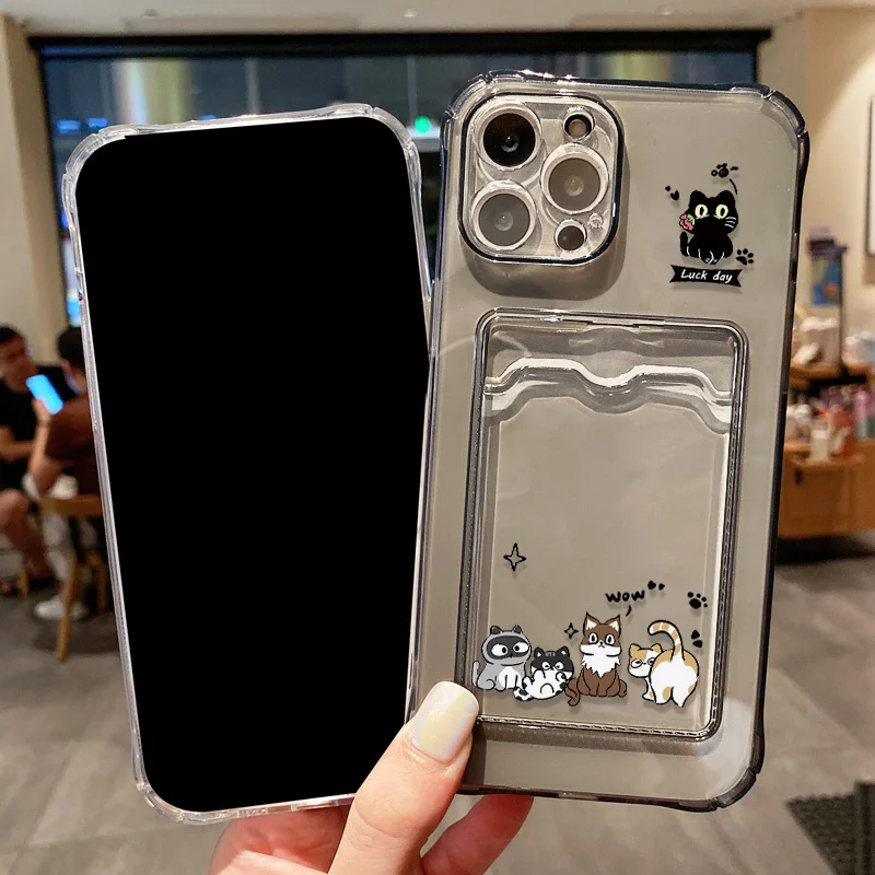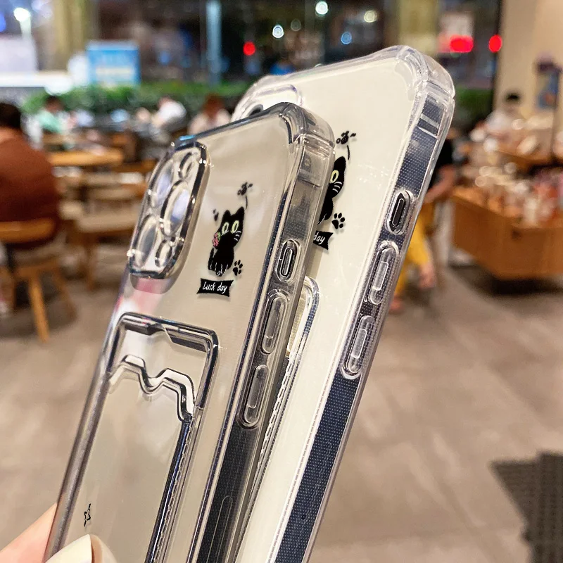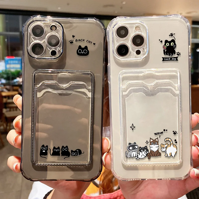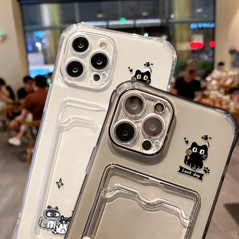 Cute Black Cat Phone Case For Xiaomi Redmi Note 13 12 11 10 9 8 14C 13C 12C 10C 11S 10S Silicone Transparent Card Pocket Cover