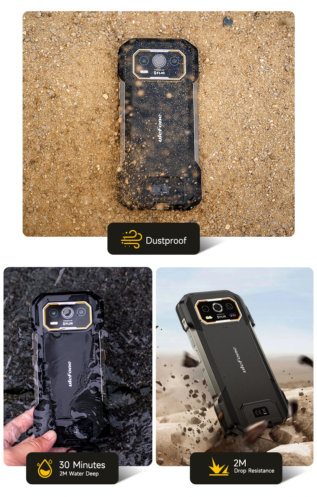 Ulefone Rugged Phone is water and dust resistant. It was tested with a rating of IP68 in an under-controlled laboratory conditions under IEC standard 60529(maxinum depth of 1.5 meters up to 30 minutes). Splash water and dust resistsnce are not permanent conditions, and resistance might decrease as a result of normal wear. Do not attempt to charge a wet Phone; Please refer to the user guide for cleaning and drying instructions. Liquid damage is not covered under warranty.